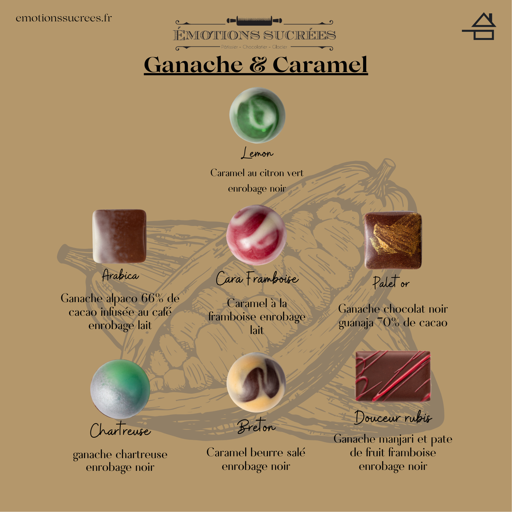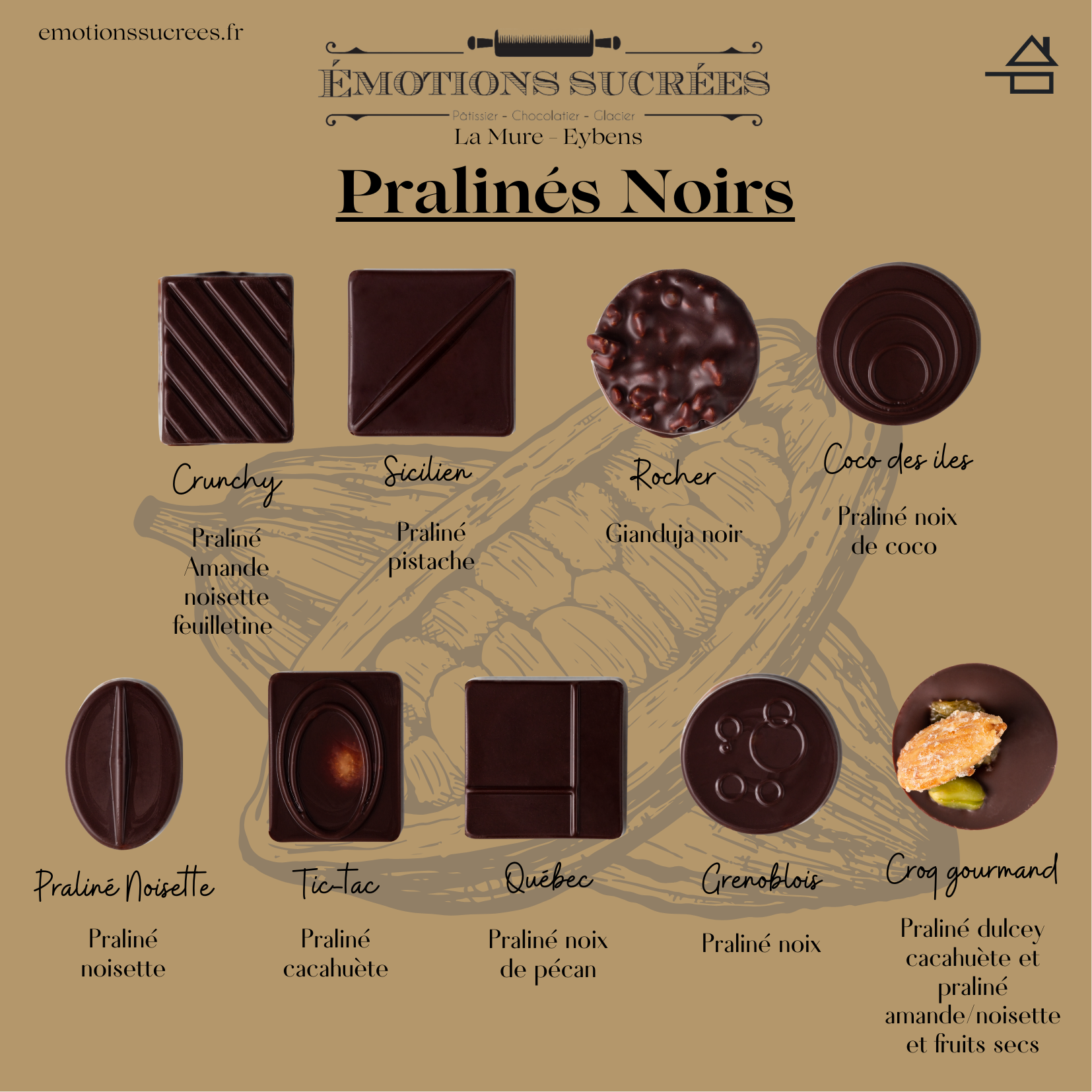 « Assortiment de chocolats comprenant des variétés de chocolat noir, au lait, praliné, ganache et caramel.