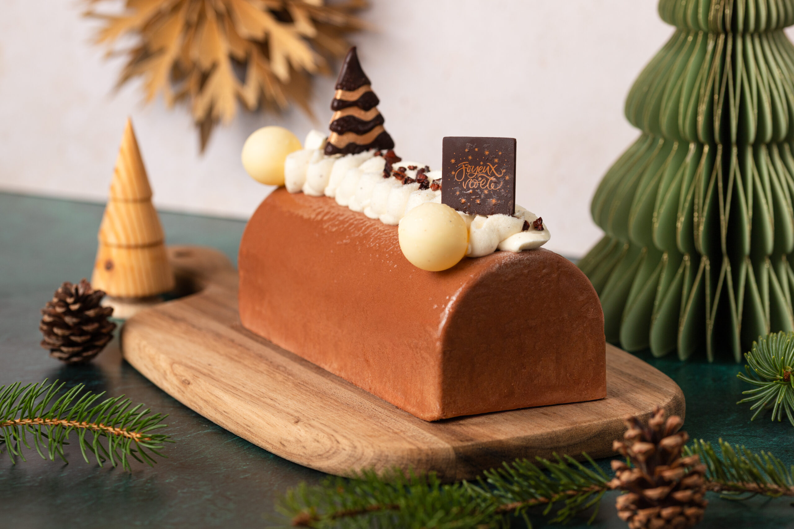 Une bûche intensément chocolat, alliant croustillant noir, mousse 70% et douceur vanille.