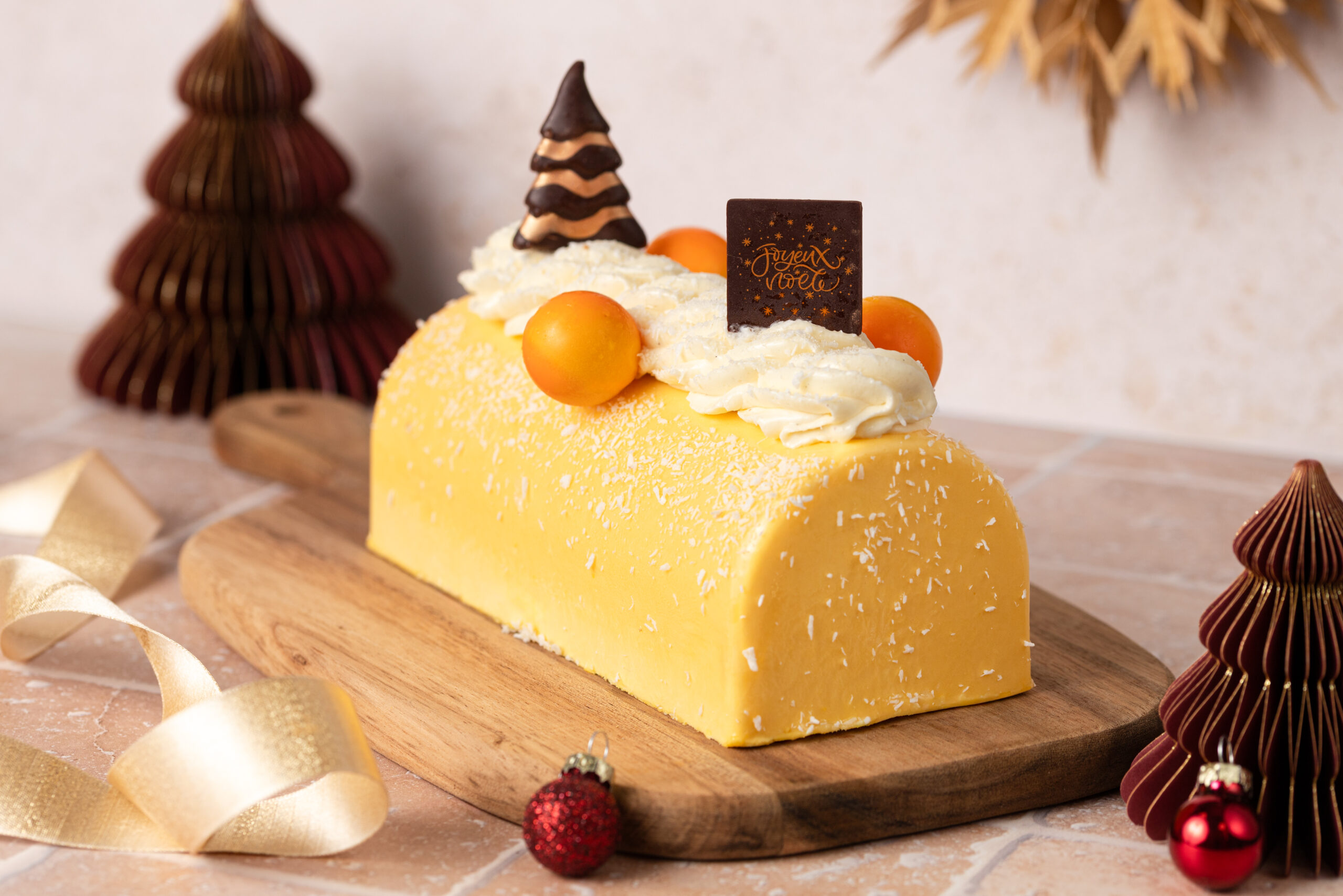 Une bûche exotique et raffinée, mêlant la douceur de la coco à la fraîcheur du citron vert.