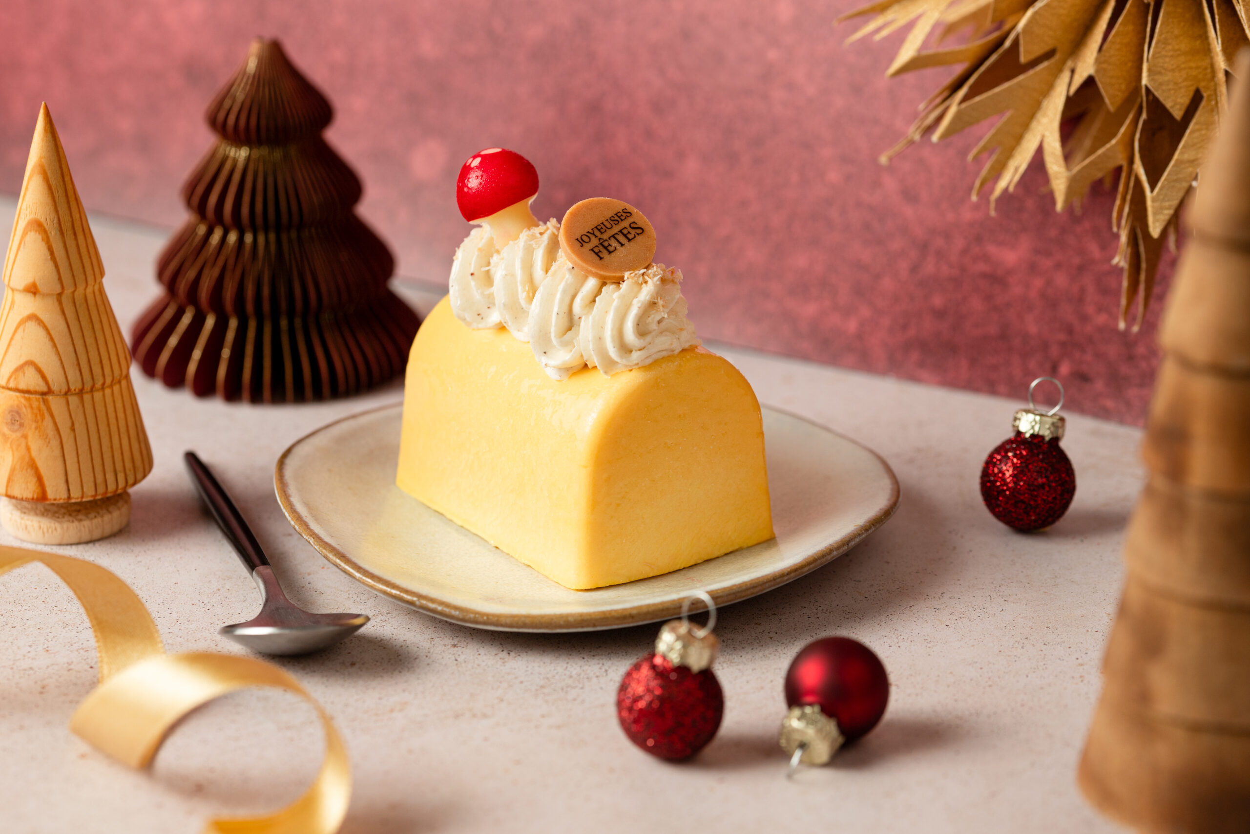 Bûchette exotique : coco croustillante, citron vert, mangue–ananas et mousse passion… un voyage tropical à chaque bouchée.