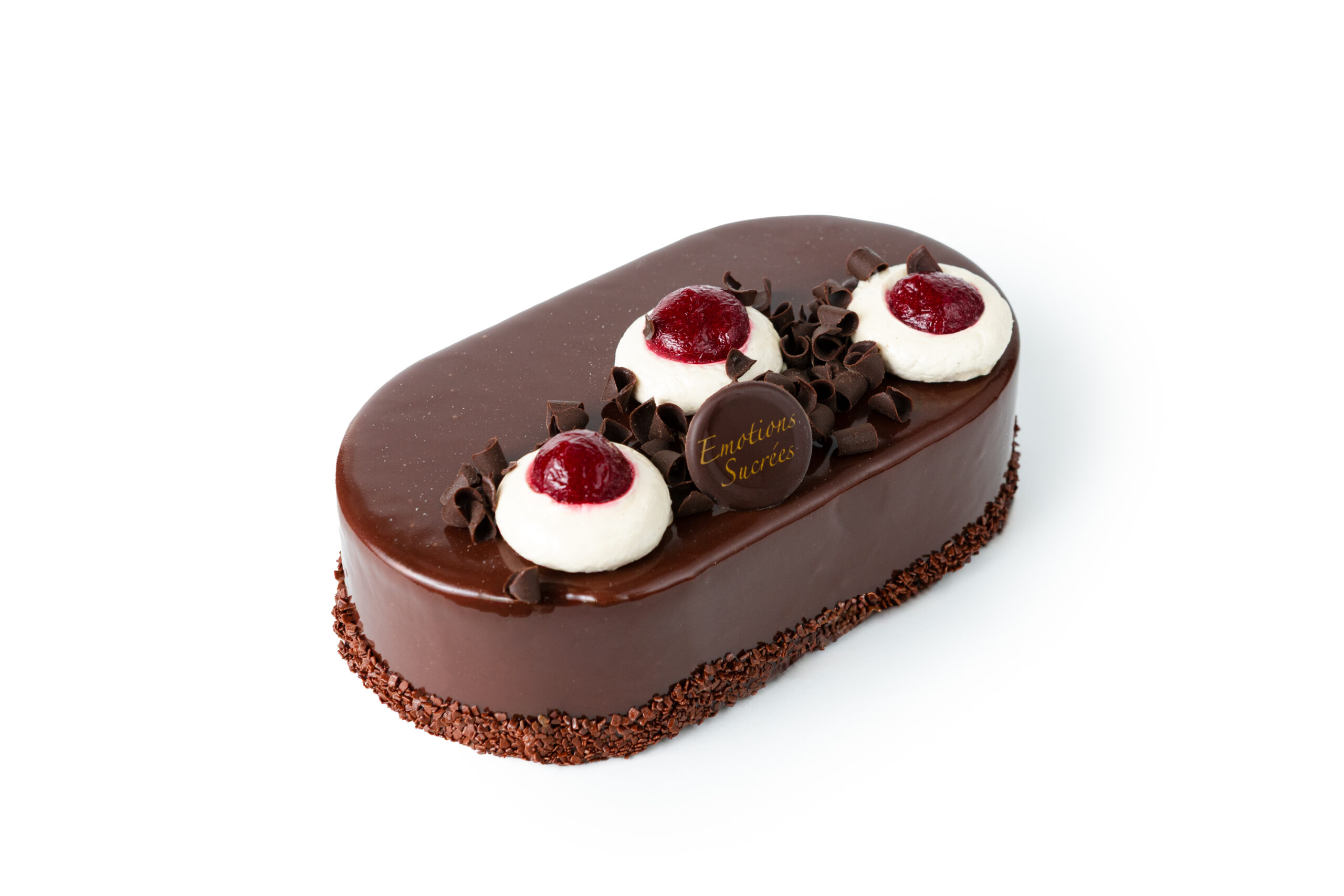 Composition : croustillant chocolat noir, biscuit chocolat sans farine, cerise semi-confite, crémeux griotte/framboise, compotée de griotte/framboise, mousse chocolat Nyangbo 68% et chantilly vanille..