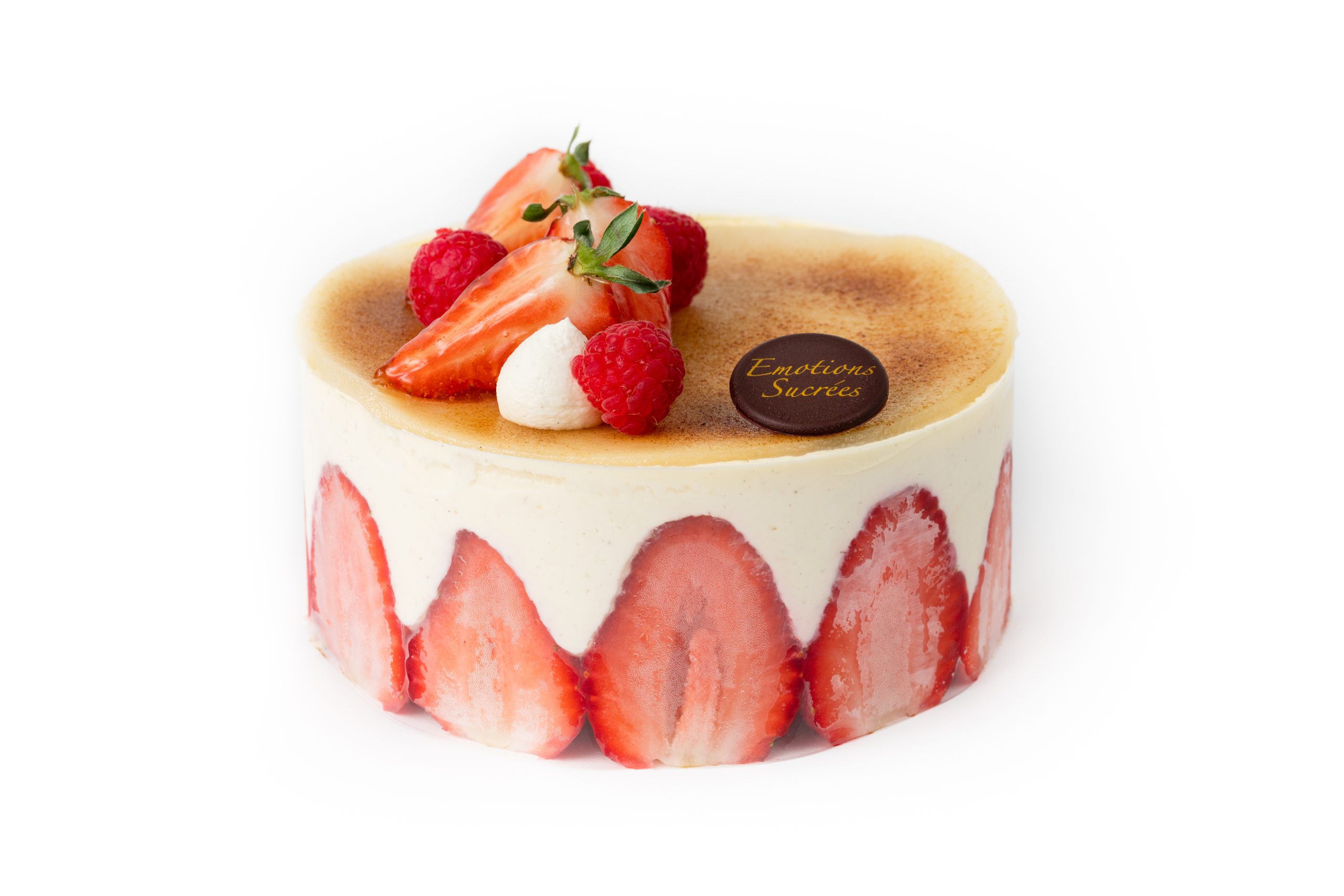 Crème diplomate (crème pâtissière vanille : lait, jaunes d’œufs, sucre, amidon de maïs, beurre, gélatine de poisson, vanille ; crème), fraises, biscuit cuillère (blancs et jaunes d’œufs, sucre, farine de blé T55, amidon de maïs), ganache montée ivoire vanille (crème, chocolat ivoire, glucose, trimoline, vanille).