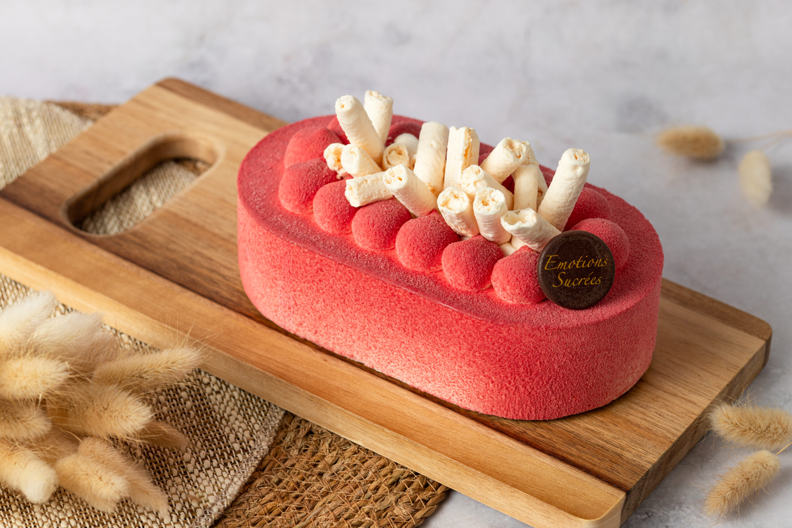 Un dessert glacé mêlant dacquoise vanille, glace onctueuse, sorbet fruits rouges et meringue craquante, pour une bouchée fraîche et gourmande