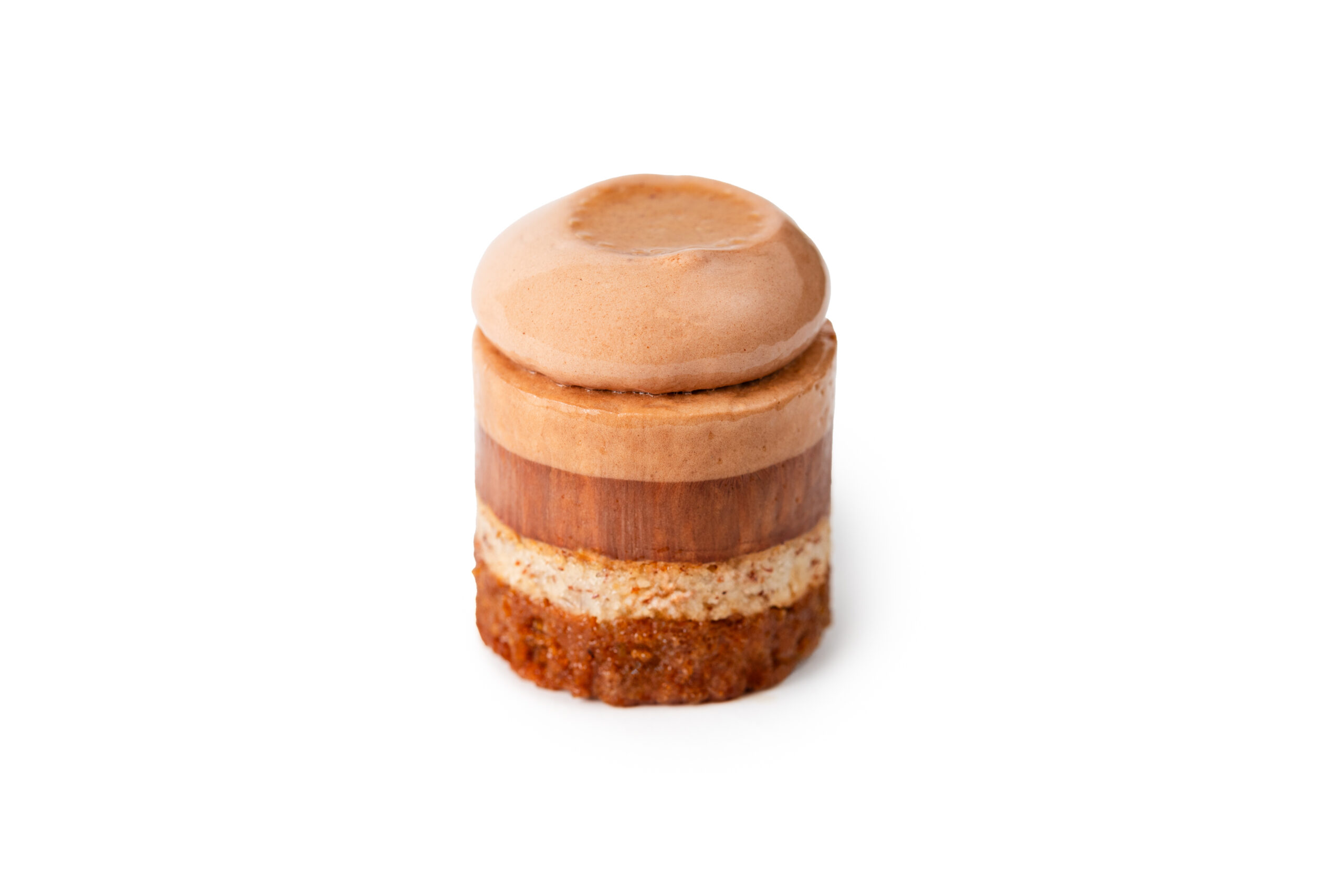 Composition : croustillant praliné, biscuit dacquoise amande brute, crémeux gianduja noisette noir, crème bavaroise gianduja noisette noir et ganache montée extra bitter.