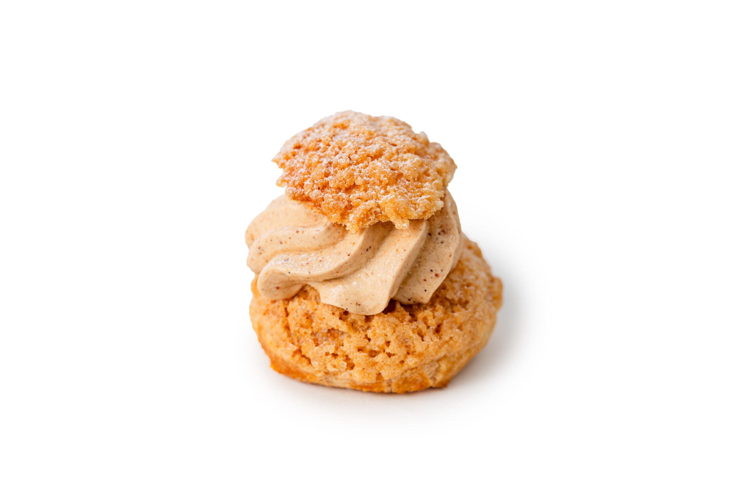 Composition : choux craquelin, praliné noisette, crème mousseline praliné noisette.