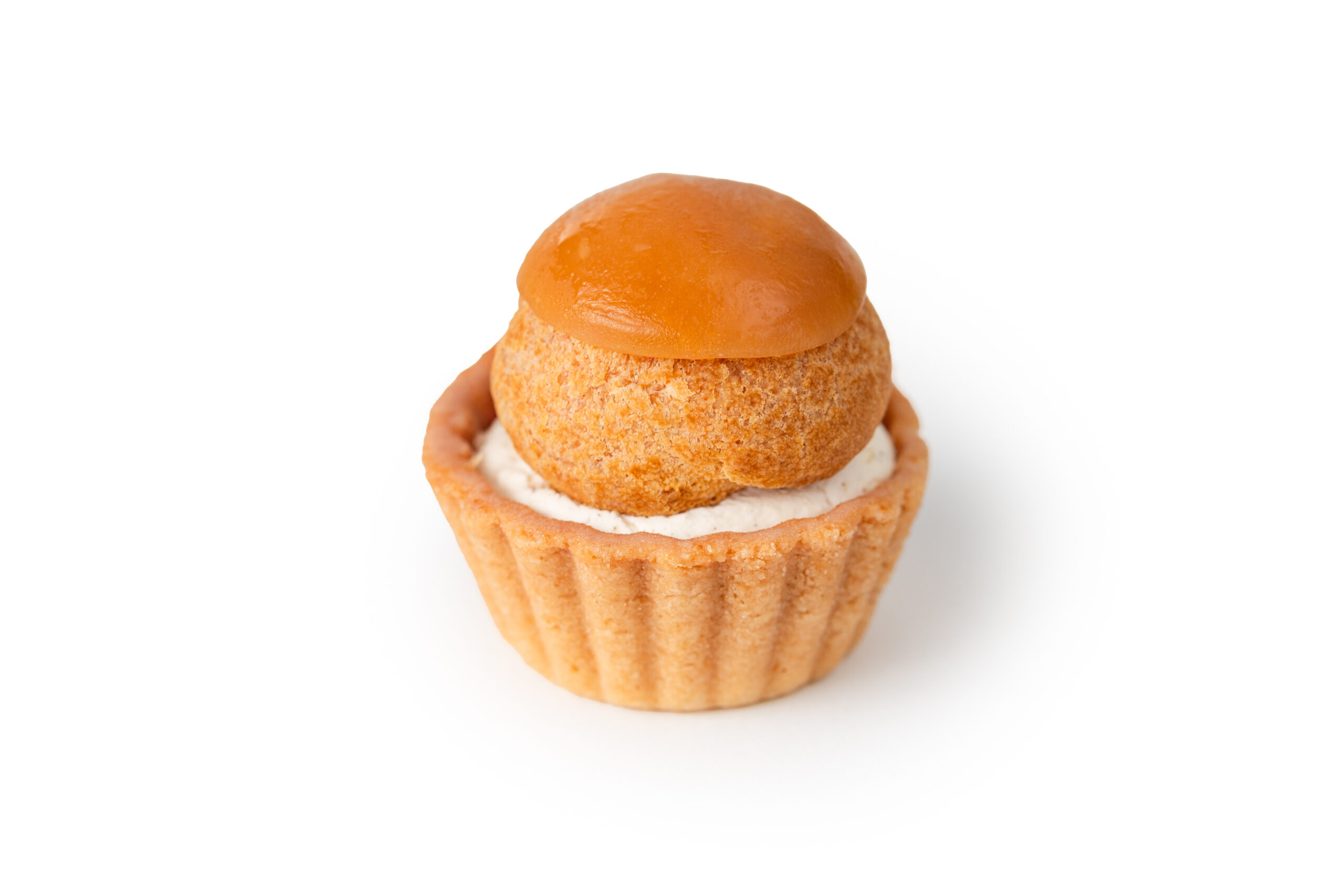 Une tartelette mêlant caramel fondant, crème diplomate et choux glacés pour une gourmandise irrésistible